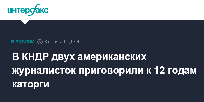 Москва. 8 июня. INTERFAX.RU - Суд в КНДР приговорил двух американских журналисток к 12 годам каторжных работ, передают в понедельник южнокорейские СМИ со ссылкой на сообщение северокорейского агентства ЦТАК.