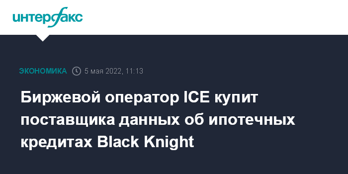Москва. 5 мая. INTERFAX.RU - Американский биржевой оператор Intercontinental Exchange Inc. (ICE) покупает поставщика данных об ипотечных кредитах Black Knight Inc. за $13,1 млрд, говорится в совместном пресс-релизе сторон.