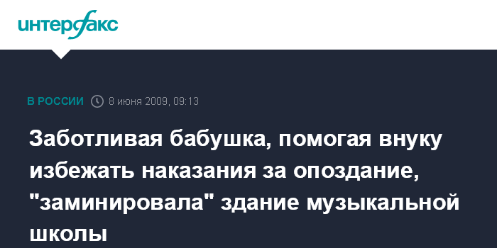 "Мальчик пожаловался своей бабушке, что педагог в школе опоздание на занятие расценивает как отсутствие. Чтобы помочь разволновавшемуся ребенку, пенсионерка решила позвонить в музыкальную школу и сообщить в заложенной бомбе. Она рассчитывала, что пока в музыкальной школе будут эвакуировать учащихся, ее внук успеет добежать до школы и таким образом не опоздает на урок", - сообщили в пресс-службе. В настоящее время в отношении подозреваемой женщины возбуждено уголовное дело, отметили в полиции.