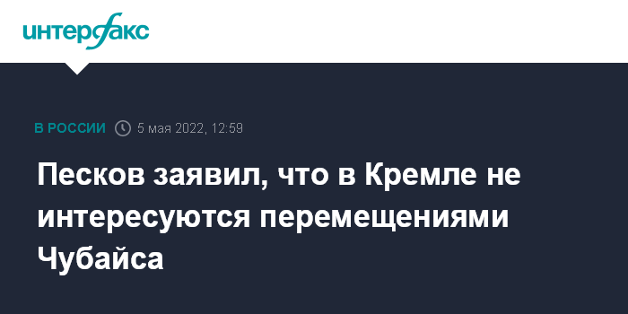 Песков заявил, что в Кремле не интересуются перемещениями Чубайса