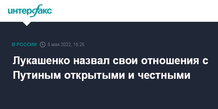 Москва. 5 мая. INTERFAX.RU - Президент Белоруссии Александр Лукашенко назвал очень близкими и честными свои отношения с президентом России Владимиром Путиным. Он сказал об этом в интервью АР. Беседа проходила в Минске.