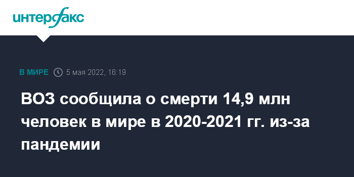 Москва. 5 мая. INTERFAX.RU - Всемирная организация здравоохранения (ВОЗ) заявила, что в период с 1 января 2020 по 31 декабря 2021 показатель так называемой избыточной смертности из-за COVID-19 составил около 14,9 млн человек.