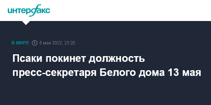Москва. 5 мая. INTERFAX.RU - Пресс-секретарь Белого дома Джен Псаки покинет эту должность позже в мае, ее преемницей станет Карин Жан-Пьер, сообщает в четверг администрация США.