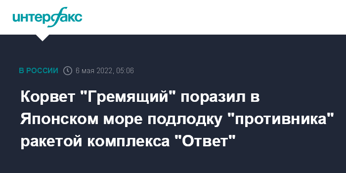 Москва. 6 мая. INTERFAX.RU - Корвет "Гремящий" Тихоокеанского флота (ТОФ) успешно произвёл пуск ракеты противолодочного комплекса "Ответ" по подводной учебной цели в акватории Японского моря, отрабатывался удар по субмарине потенциального противника.