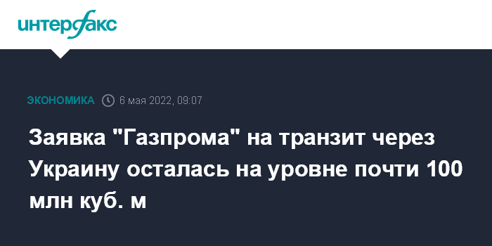 Москва. 6 мая. INTERFAX.RU - Заявки на поставку российского газа через Украину с начала мая стабилизировались на высоком уровне – почти 100 млн кубометров в сутки, что близко к объему долгосрочного бронирования украинского коридора (40 млрд куб. м в год, или 109 млн куб. м в день).