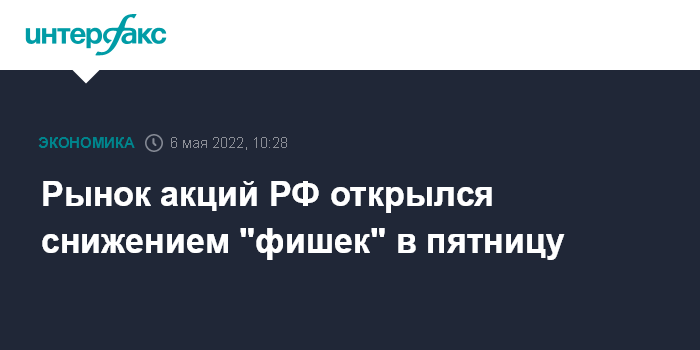 Москва. 6 мая. INTERFAX.RU - Рынок акций РФ открылся в пятницу снижением цен blue chips на фоне ухудшения внешней фондовой конъюнктуры, а также в преддверии очередных длительных выходных из-за геополитических и санкционных рисков; индекс МосБиржи за минуту торгов просел на 0,5%, индекс РТС подрос на 0,4% на фоне укрепления рубля.