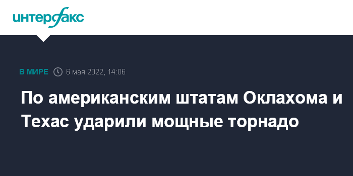 Москва. 6 мая. INTERFAX.RU - Несколько мощных торнадо пронеслись по американским штатам Оклахома и Техас, нанесен серьезный материальный ущерб, сообщил в пятницу телеканал ABC.