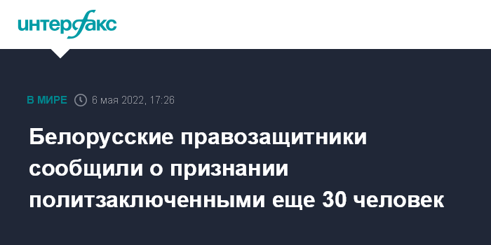 Москва. 6 мая. INTERFAX.RU - Еще 30 человек признаны политзаключенными в Белоруссии, сообщили в незарегистрированном в республике правозащитном центре "Весна" в пятницу.