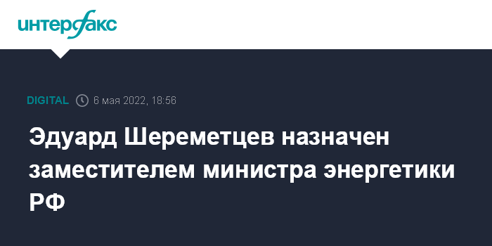 Москва. 6 мая. INTERFAX.RU - Эдуард Шереметцев назначен заместителем министра энергетики РФ - соответствующее распоряжение премьера Михаила Мишустина от 5 мая опубликовано на официальном интернет-портале правовой информации.