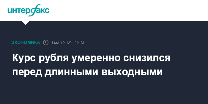 Москва. 6 мая. INTERFAX.RU - Курс рубля к доллару и евро умеренно снизился на "Мосбирже" в пятницу перед длинными выходными днями после достижения в предыдущие дни более чем двухлетних максимумов. На рынке выросли ожидания возможных заявлений Банка России о смягчении введенных ранее ограничений на валютные операции.