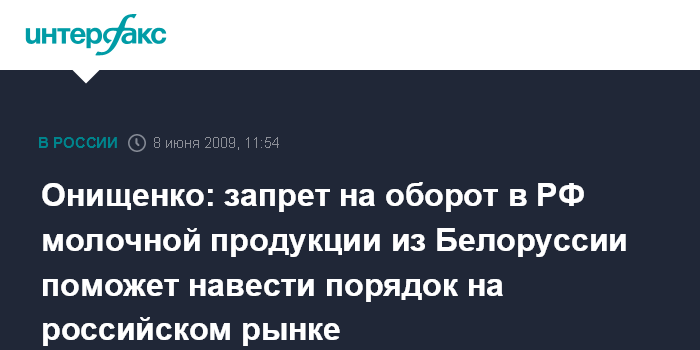 Онищенко сказал, что запрет на оборот в РФ нескольких сотен видов молочной продукции из Белоруссии является "лишь одним из шагов на почти годовом пути по наведению порядка с оборотом молока и молочной продукции на рынке нашей страны".