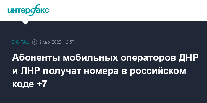 Москва. 7 мая. INTERFAX.RU - Донецкая и Луганская народные республики (ДНР и ЛНР) с 7 мая включены в российский план нумерации +7, номера абонентов мобильной связи будут отображаться с российским телефонным кодом, говорится в сообщении Минцифры РФ.
