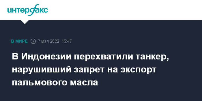 Москва. 7 мая. INTERFAX.RU - ВМС Индонезии задержали танкер, который пытался вывести из страны в Малайзию груз пальмового масла, несмотря на введенный ранее индонезийскими властями запрет на экспорт этого товара, сообщило в субботу издание Channel NewsAsia.