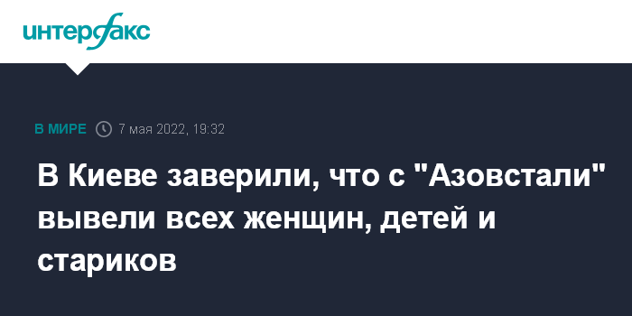 Москва. 7 мая. INTERFAX.RU - С территории "Азовстали" удалось вывести всех женщин, детей и пожилых людей, сообщила вице-премьер Украины Ирина Верещук.