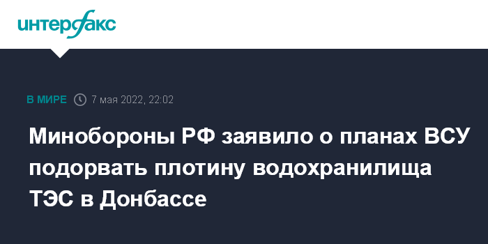 Москва. 7 мая. INTERFAX.RU - Минобороны РФ заявляет, что в Покровском районе Донецкой народной республики украинские военнослужащие заминировали плотину водохранилища Кураховской теплоэлектростанции.