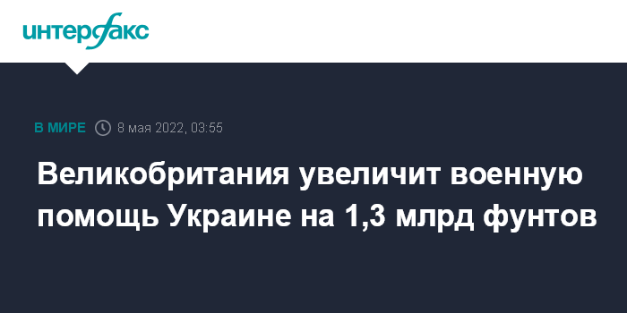 Москва. 8 мая. INTERFAX.RU - Великобритания намерена выделить на оказание военной помощи Украине дополнительно 1,3 млрд фунтов стерлингов (1,6 млрд долларов), сообщают британские СМИ со ссылками на власти страны.