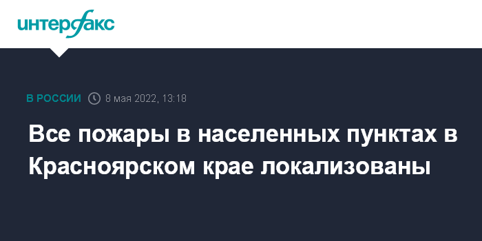 Москва. 8 мая. INTERFAX.RU - Пожары в шести населенных пунктах продолжают действовать в Красноярском крае, все они локализованы, сообщает в воскресенье пресс-служба Главного управления МЧС РФ по региону.
