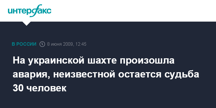 Об этом агентству "Интерфакс-Украина" сообщил источник в Госгорпромнадзоре Украины в Донецкой области. Более точных данных об аварии пока нет, отметил он. По данным источника, на аварийном участке находилось предположительно 53 человека. По предварительным данным 18 вышли на поверхность. Судьба остальных остается не известной.