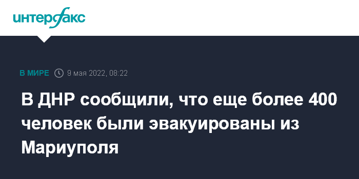 Москва. 9 мая. INTERFAX.RU - Из Мариуполя за прошлые сутки на территорию ДНР эвакуированы 408 человек, 65 из них дети, сообщает штаб территориальной обороны Донецкой народной республики.