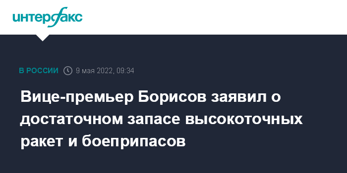 Москва. 9 мая. INTERFAX.RU - Оборонно-промышленный комплекс РФ в полном объеме закрывает потребности Минобороны в высокоточных ракетах, запасы есть, сообщил в интервью "Интерфаксу" вице-премьер Юрий Борисов.