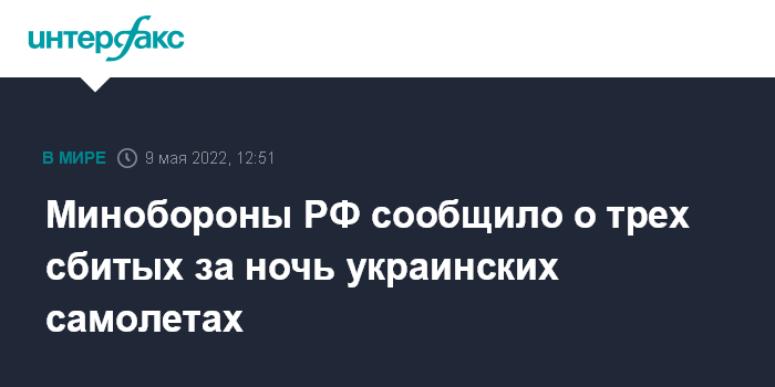 Москва. 9 мая. INTERFAX.RU - Три самолета воздушных сил Украины сбиты за ночь, сообщил официальный представитель министерства обороны РФ Игорь Конашенков на брифинге в понедельник.