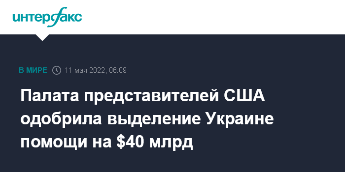 Москва. 11 мая. INTERFAX.RU - Палата представителей Конгресса США во вторник поддержала увеличение пакета помощи Украине до $40 млрд, сообщает Associated Press.