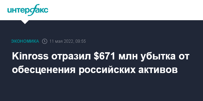Как говорится в материалах Kinross, чистый убыток компании от деятельности в России составил в I квартале $606,1 млн, включая убыток от обесценения в размере $671 млн, связанный с переоценкой российских активов по справедливой стоимости за вычетом затрат на продажу.