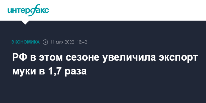Москва. 11 мая. INTERFAX.RU - РФ в этом сезоне (с июля 2021 года по март 2022 года) экспортировала почти 259 тысяч тонн муки, что в 1,7 раза больше, чем годом ранее (154,6 тысяч тонн). Об этом сообщили "Интерфаксу" в Союзе экспортеров зерна со ссылкой на данные ФТС.