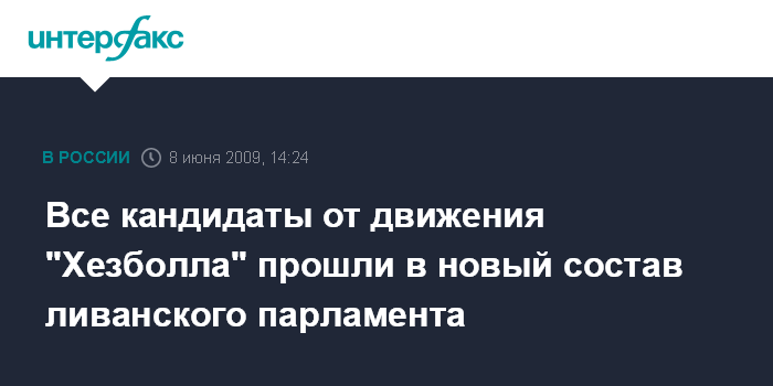 Москва. 8 июня. INTERFAX.RU - Все 11 кандидатов от движения "Хезболла" по итогам состоявшихся выборов получат места в новом парламенте Ливана , сообщает иранский телеканал "Пресс-ТВ".