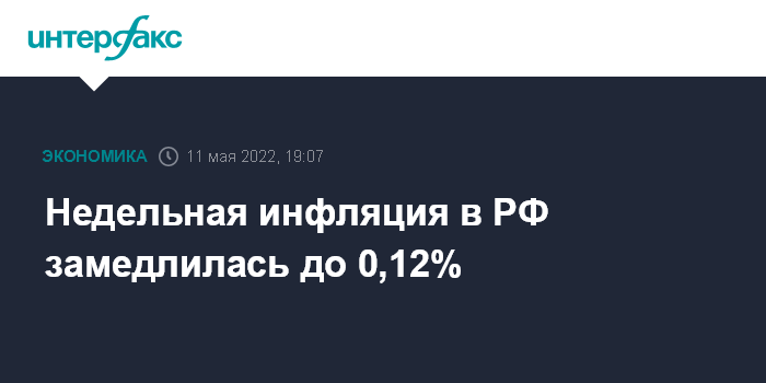 Москва. 11 мая. INTERFAX.RU - Инфляция в РФ с 30 апреля по 6 мая составила 0,12% после 0,21% с 23 по 29 апреля, 0,25% с 16 по 22 апреля, 0,20% с 9 по 15 апреля, 0,66% со 2 по 8 апреля, 0,99% с 26 марта по 1 апреля, 1,16% с 19 по 25 марта, 1,93% с 12 по 18 марта, 2,09% с 5 по 11 марта, 2,22% с 26 февраля по 4 марта, 0,45% с 19 по 25 февраля, сообщил Росстат.
