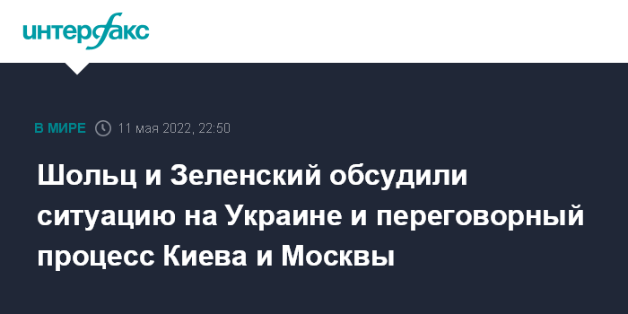 Москва. 11 мая. INTERFAX.RU - Канцлер ФРГ Олаф Шольц в телефонном разговоре с президентом Украины Владимиром Зеленским в среду получил информацию о "текущей ситуации и переговорном процессе" между РФ и Украиной, говорится в пресс-релизе правительства ФРГ.