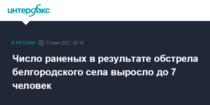 Москва. 12 мая. INTERFAX.RU - При обстреле села Солохи в Белгородской области ранения получили семь человек, сообщил губернатор региона Вячеслав Гладков.