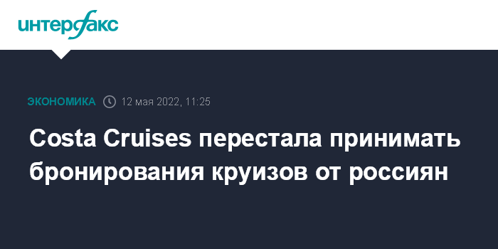 Москва. 12 мая. INTERFAX.RU - Круизная компания Costa Cruises (входит в американский круизный холдинг Carnival Corporation), прекратила подтверждать бронирования от туристов из России и Белоруссии, а также с территорий ДНР и ЛНР, сообщил "Вестник Ассоциации туроператоров России".