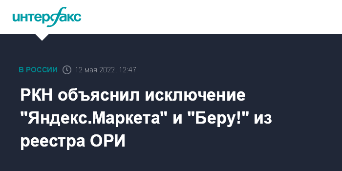 Москва. 12 мая. INTERFAX.RU - Роскомнадзор исключил "Яндекс.Маркет" и "Беру!" из реестра организаторов распространения информации (ОРИ), которые обязаны предоставлять данные пользователей по запросу спецслужб, в связи с изменениями юридических лиц, объяснили "Интерфаксу" в РКН.