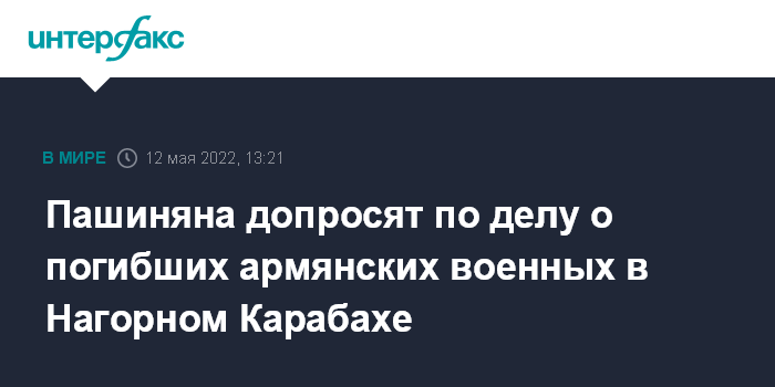 Москва. 12 мая. INTERFAX.RU - Премьер-министр Армении Никол Пашинян будет допрошен в качестве свидетеля по делу об обстоятельствах причин войны в Нагорном Карабахе, приведших к катастрофическим последствиям, заявил адвокат родителей погибших военнослужащих Ваан Ованнисян.