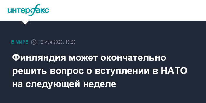 Москва. 12 мая. INTERFAX.RU - Депутаты финского парламента, как ожидается, уже на следующей неделе могут окончательно утвердить решение о подаче заявки на вступление в НАТО, сообщает в четверг агентство EFE.
