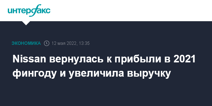 Москва. 12 мая. INTERFAX.RU - Японский автопроизводитель Nissan Motor получил чистую прибыль в 2021 финансовом году, завершившемся 31 марта, и увеличил выручку.