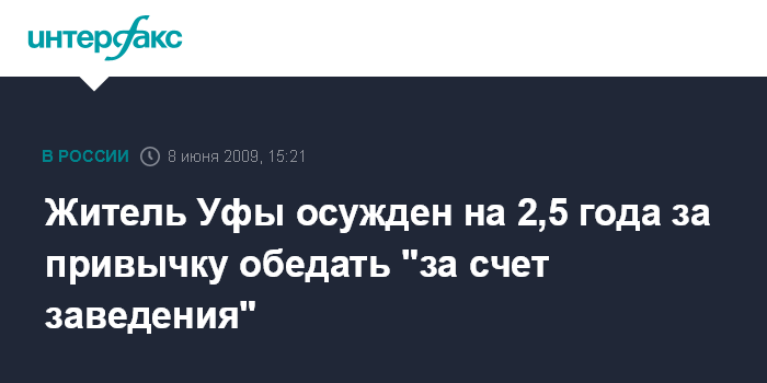 Москва. 8 июня. INTERFAX.RU - Кировский районный суд Уфы приговорил к 2,5 годам в колонии общего режима 27-летнего местного житель города за привычку бесплатно обедать в ресторанах. Как сообщает пресс-служба прокуратуры Башкирии, было установлено, что подсудимый 30 ноября 2008 г., находясь в ресторане, расположенном в ТДК "Гостиный двор" и не имея возможности расплатиться, сделал заказ на общую сумму около 4 тысяч рублей. После предъявления ему счета он его не оплатил и скрылся с места происшествия.