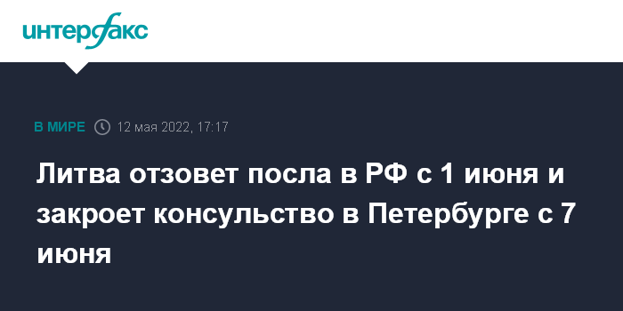 Литва отзовет посла в РФ с 1 июня и закроет консульство в Петербурге с 7 июня