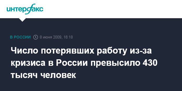 Москва. 8 июня. INTERFAX.RU - По данным Минздравсоцразвития РФ, в России с началом кризиса растет число уволенных работников, по состоянию на начало июня их уже боле 430 тыс. человек, причем трудоустроиться удалось менее трети из них. В сообщении пресс-службы министерства, распространенном в понедельник, говорится, что с начала октября 2008 г. численность уволенных работников достигла 434594 человек, из них было трудоустроено 129159 человек, в том числе 72039 человек - в прежних организациях.