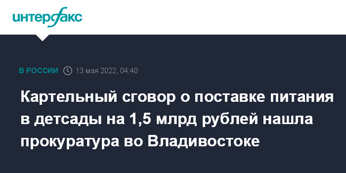 Москва. 13 мая. INTERFAX.RU - Уголовное дело о картельном сговоре на 1,5 млрд рублей в сфере организации питания детей в детсадах возбудили во Владивостоке по материалам прокурорской проверки, сообщает региональная прокуратура.