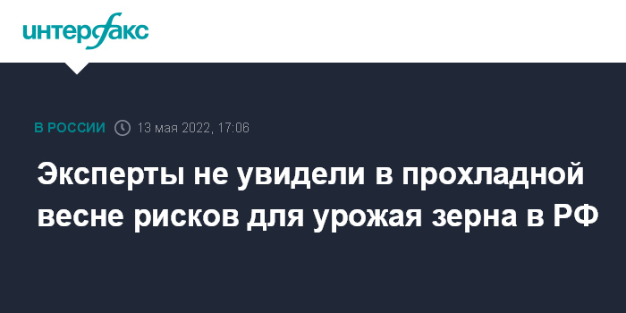 Москва. 13 мая. INTERFAX.RU - Прохладная весна не повлияет на урожай зерновых и зернобобовых культур в РФ в этом году, он превысит 130 млн тонн, прогнозируют эксперты, опрошенные "Интерфаксом".