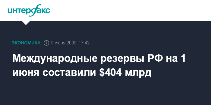 Москва. 8 июня. INTERFAX.RU - Международные резервы РФ на 1 июня 2009 года составили $404 млрд, сообщил премьер-министр РФ Владимир Путин на встрече с руководством "Единой России" в понедельник.