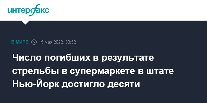 Москва. 15 мая. INTERFAX.RU - Число погибших в результате стрельбы в супермаркете американского города Буффало (штат Нью-Йорк) достигло десяти. Об этом сообщает Associated Press со ссылкой на два источника в правоохранительных органах.