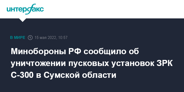 Москва. 15 мая. INTERFAX.RU - Минобороны РФ сообщило, что российская авиация уничтожила две украинские пусковые установки комплекса ПВО С-300 в Сумской области.