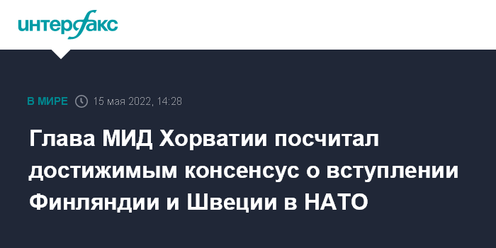 Москва. 15 мая. INTERFAX.RU - Страны НАТО способны добиться консенсуса по вопросу о приглашении в альянс Швеции и Финляндии, заявил в воскресенье глава МИД Хорватии Гордан Грлич-Радман.