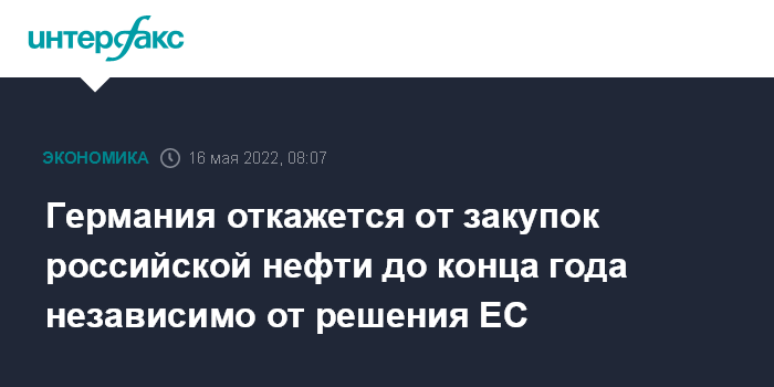 Москва. 16 мая. INTERFAX.RU - Германия планирует прекратить импорт российской нефти к концу года, даже если Европейский союз не сможет договориться о введении общеевропейского эмбарго в рамках следующего пакета санкций, сообщает Bloomberg со ссылкой на правительственные источники.