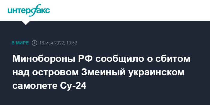 Москва. 16 мая. INTERFAX.RU - Российские военные сбили два украинских штурмовика Су-25, а также бомбардировщик Су-24 над островом Змеиный в Черном море, заявил официальный представитель Минобороны РФ Игорь Конашенков.