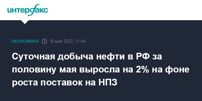 Суточная добыча нефти в РФ за половину мая выросла на 2% на фоне роста поставок на НПЗ