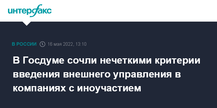 Москва. 16 мая. INTERFAX.RU - Критерии для введения внешнего управления в компаниях с недружественным иностранным участием, указанные в депутатском законопроекте, "не отвечают требованиям ясности и четкости", считает правовое управление Госдумы.
